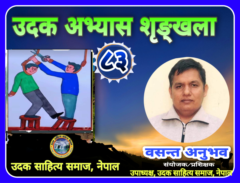 काठमाण्डौँ, ९ पौष । साप्ताहिक तस्बिरमा उदक लेखन शृङ्खलाको ८३औँ भाग शनिबार सम्पन्न भएको छ । उदक साहित्य समाज, नेपालले उक्त कार्यक्रमको आयोजना गरेको थियो। उक्त शृङ्खलामा नेपाल लगायत विश्वका ७२ जना उदक स्रष्टाहरूको सहभागिता रहेको उदक लेखन शृङ्खलाका संयोजक, प्रशिक्षक एवं उदक साहित्य समाजका उपाध्यक्ष वसन्त अनुभवले बताउनुभयो ।