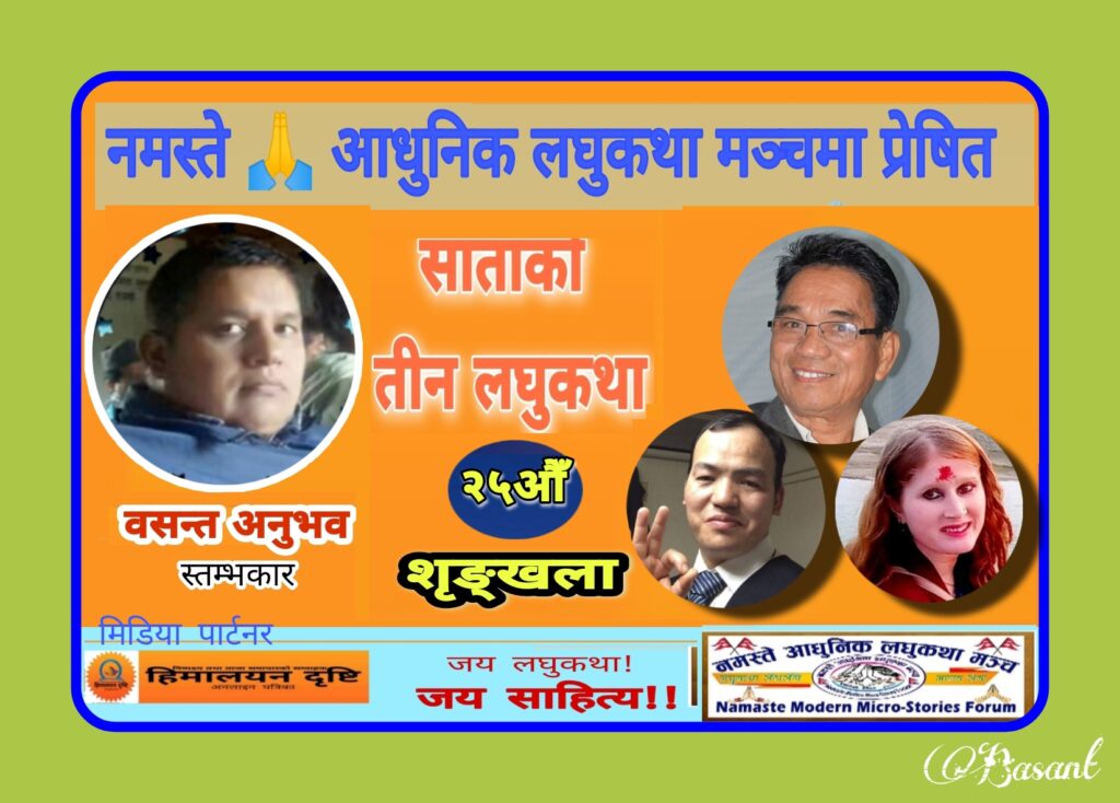 साताका तीन लघुकथा हिमालयन दृष्टि अनलाइन पत्रिकामार्फत सञ्चालित एक नियमित स्तम्भ हो । नमस्ते आधुनिक लघुकथा मञ्चको भित्तोमा साताभर प्रेषित गरिएका लघुकथाहरू मध्येबाट उत्कृष्ट तीन लघुकथा छ्नोट गरी प्राप्त हुन आएका लघुकथाहरू यहाँ प्रकाशन गर्ने गरिन्छ । यस साता प्रकाशित हुने लघुकथाहरूमा लघुकथाकार टङ्कबहादुर आलेमगरको ‘मुसो’, लघुकथाकार म्यामराज राईको ‘एक घुट्को’ र लघुकथाकार ज्यो.नानी बिवुको ‘जिम्मेवारी बोध’ रहेका छन् ।