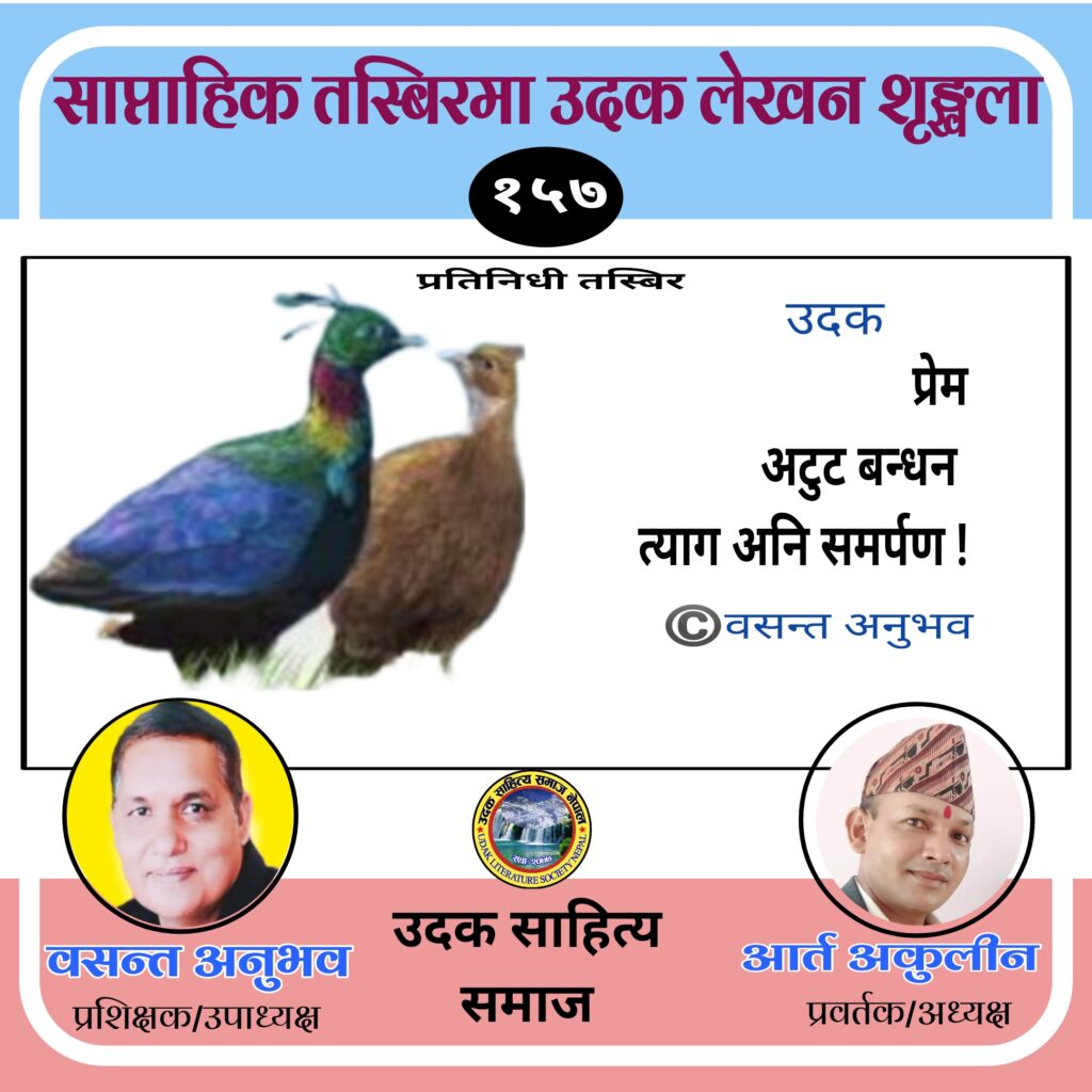 साप्ताहिक तस्बिरमा उदक लेखन शृङ्खलाको १५७ औँ भाग शनिबार सम्पन्न भएको छ । उदक साहित्य समाज, नेपालले उक्त कार्यक्रमको आयोजना गरेको थियो। उक्त शृङ्खलामा नेपाल लगायत विश्वका ८० जना उदक स्रष्टाहरूको सहभागिता रहेको उदक लेखन शृङ्खलाका संयोजक, प्रशिक्षक एवं उदक साहित्य समाजका केन्द्रिय उपाध्यक्ष वसन्त अनुभवले बताउनुभयो ।