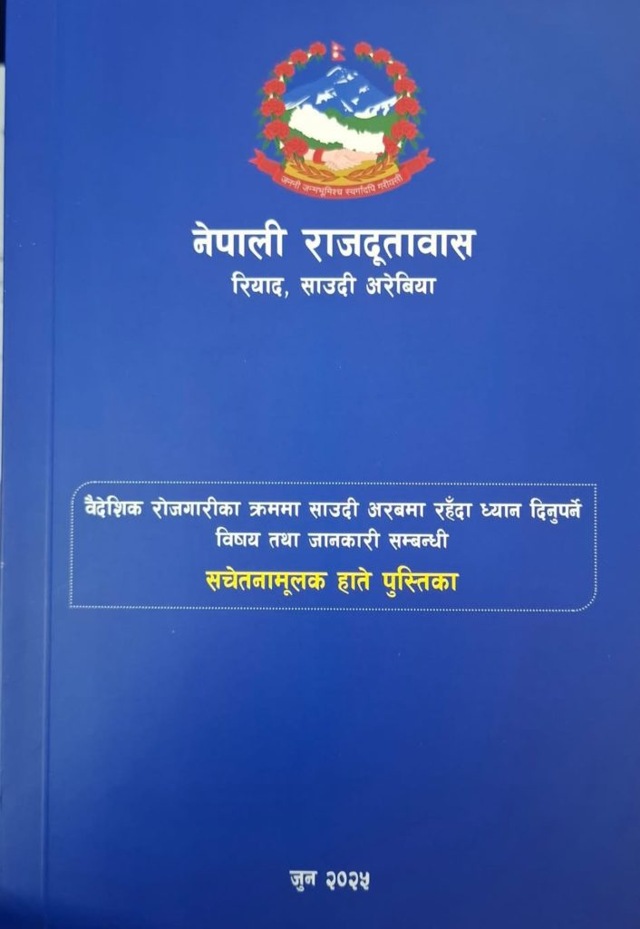 रियाद, साउदी अरेबिया – नेपाली राजदूतावास, रियादले साउदी अरेबियामा कार्यरत नेपाली श्रमिकहरूलाई लक्षित गर्दै सचेतनामूलक हाते पुस्तिका विमोचन गरेको छ। विशेष कार्यक्रमको आयोजना गरी सार्वजनिक गरिएको उक्त पुस्तिका नेपाली श्रमिकहरूबीच कानुनी, सामाजिक र व्यवहारिक पक्षमा जनचेतना फैलाउने उद्देश्यले तयार गरिएको हो।