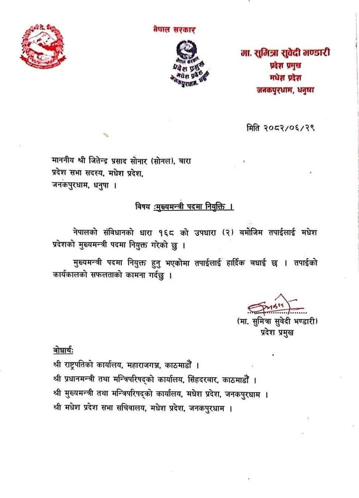 मधेश प्रदेशमा नयाँ नेतृत्व: जितेन्द्र सोनलले पाए मुख्यमन्त्रीको जिम्मा