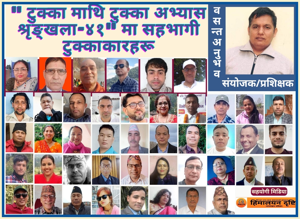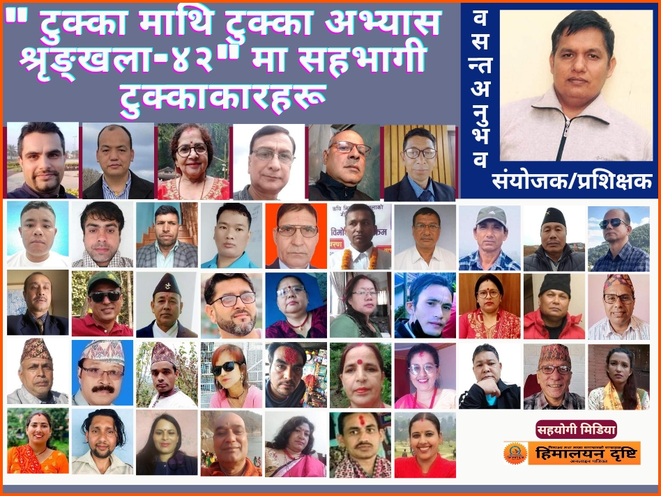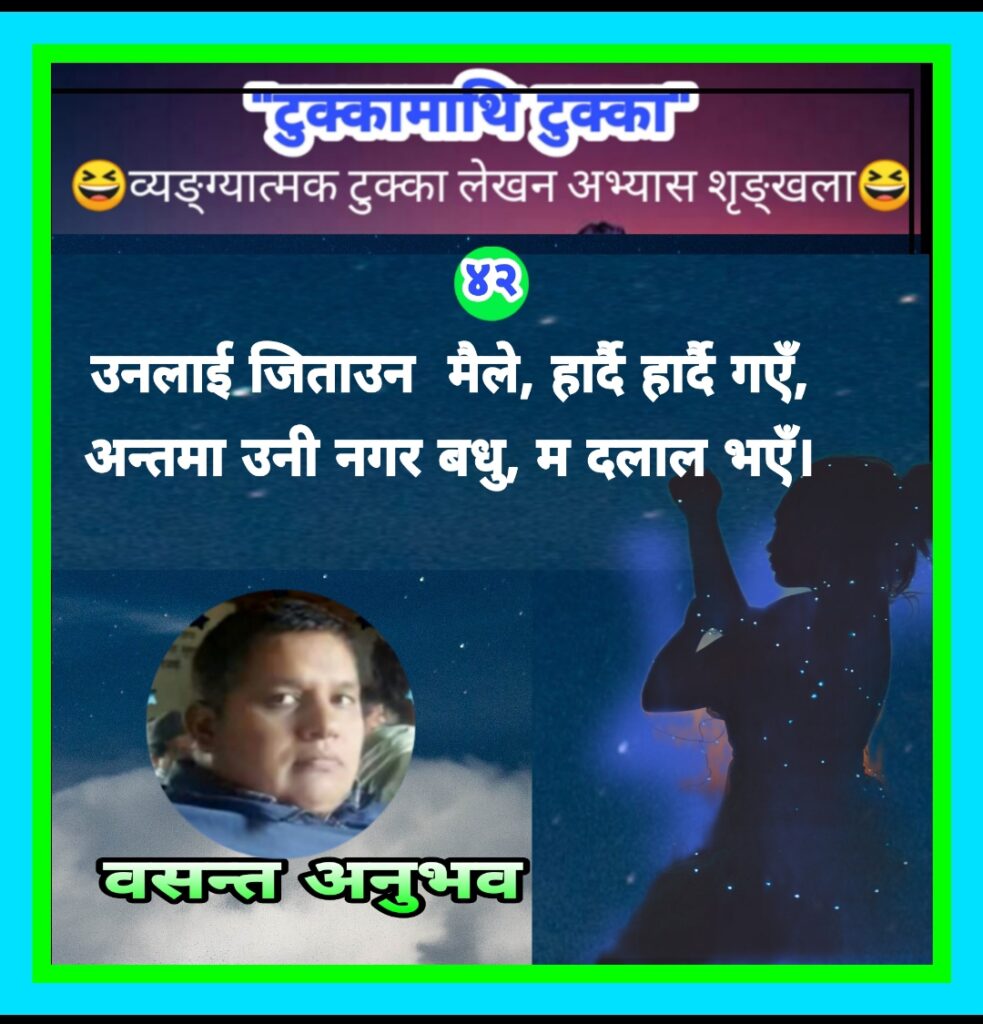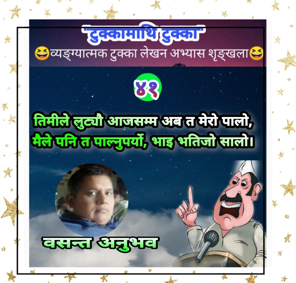 ‘टुक्का माथि टुक्का’ व्यङ्ग्यात्मक टुक्का लेखनको ४२ औँ शृङ्खलाको लागि समाजका वरिष्ठ टुक्काकार वसन्त अनुभवले समसामयिक विषयमा लेख्नुभएको व्यङ्ग्यात्मक टुक्कालाई राखिएको संयोजक अनुभवले बताउनुभयो ।