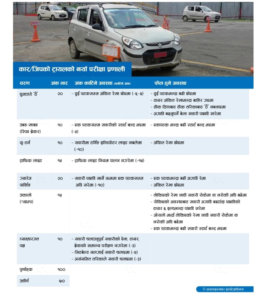कार/जिपको ट्रायल कार, जिप र भ्यानको ट्रायलको पूर्णाङ्क पनि १०० छ । त्यसमध्ये परीक्षाका विभिन्न चरणमा गरी ७० अंक जोड्ने परीक्षार्थीले लाइसेन्स पाउनेछन् । १. घुमाउरो ‘8’ कार जिपको ट्रायलमा पनि घुमाउरो ‘8’लाई २० अंकको भार दिइएको छ । घुमाउरो ‘8’ मा दुई पटकसम्म अंकित रेखा छुन पाइनेछ । तर, प्रत्येक पटक ५–५ अंक काटिनेछ । दुई पटकभन्दा बढी छोएमा, टायर अंकित रेखाभन्दा बाहिर गएमा, ठीक दिशाबाट ठीक तरिकाबाट ‘8’ नबनाएमा र अगाडि बढ्नुपर्ने बेला सवारी साधन पछाडि सारेमा भने परीक्षार्थी अनुतीर्ण हुनेछ । २. उबड–खाबड (स्पिड ब्रेकर) उबड–खाबड (स्पिड ब्रेकर)को चरणलाई १० अंकभार छ । एक पटकसम्म सवारीको स्टार्ट बन्द भयो भने ५ अंक काटिनेछ । तर, एकपटक भन्दा बढी स्टार्ट बन्द भएमा भने अनुतीर्ण हुनेछ । ३. यू–टर्न यू–टर्नको चरणलाई १० अंकको भार छ । युटर्न गर्दा टर्निङ इन्डिकेटर लाइट नबालेमा १० अंक काटिनेछ । तर, यो भागमा अंकित रेखा छोएमा अनुतीर्ण हुनेछ । ४. ट्राफिक लाइट ट्राफिक लाइटलाई १५ अंकभार छ । ट्राफिक लाइटको नियम पालना नगरेमा १५ अंक नै काटिनेछ । ५. उकालो (र्याम्प) उकालो (र्याम्प)लाई १५ अंकभार छ । यो भागमा तोकिएको रेखा नाघी सवारी रोकेमा वा नरोकी अघि बढेमा, रोकिएको अवस्थाबाट सवारी अगाडि बढाउँदा पछाडिको टायर ६ इन्चभन्दा पछाडि सरेमा, ओरालो झर्दा तोकिएको रेखा नाघी सवारी रोकेमा वा नरोकी अघि बढेमा, एकपटभन्दा बढी सवारी स्टार्ट बन्द भएमा परीक्षार्थी अनुतीर्ण हुनेछ । उकालोमा एकपटसम्म सवारीको स्टार्ट बन्द गर्दा अंघ घट्ने छैन । ६. ग्यारेज पार्किङ ग्यारेज पार्किङको चरणलाई २० अंकभार छ । यो भागमा सवारी पछाडि सार्ने क्रममा एक पटकसम्म अघि सरेमा १० अंक काटिनेछ । एकपटकभन्दा बढी अगाडि सरेमा वा अंकित रेखा छोएमा अनुतीर्ण हुनेछ । ७. व्यवहारगत पक्ष परीक्षार्थीको व्यवहारगत पक्षको परीक्षालाई १० अंकभार छ । सवारी साधन चलाउनुपूर्व ऐना, टायर, ब्रेकको समान्य परीक्षण नगरेमा ३ अंक, सिटबेल्ट नलगाई सवारी चलाएमा ४ र अस्वाभाविक रुपले असंयमित तरिकाले सवारी चलाएमा ३ अंक काटिनेछ ।