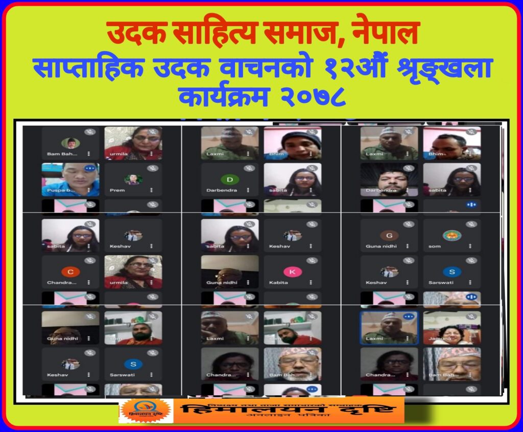उदक साहित्य समाज नेपालको साप्ताहिक उदक वाचन कार्यक्रमको बाह्रौँ शृङ्खला सम्पन्न भएको छ ।