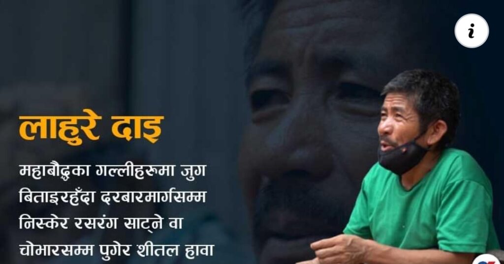 लाहुरे दाइ । महाबौद्ध गल्लीले उनलाई दिएको नाम हो, यो । तर, नाम जस्तै रवाफिलो भएन उनको जिन्दगानी । थाप्लोमा आफ्नो ज्यानभन्दा दोब्बर तौलको भारी नबोकी उनको डेढ बित्ताको पेट भरिंदैन । नाथे त्यही पेटले उनलाई यो जुनीमा भरिया बनाइदियो । साँघुरा गल्लीहरूमा जोवन बित्यो । औंला भाँचेर हिसाब गर्दा २६ वर्ष बितेछ । यहाँ त्यस्तो गल्ली नहोलान्, जहाँ उनको पदचाप नछाडिएको होस् । यस्तो कुना-काप्चा नहोलान्, जहाँ उनको पसिनाले नभिजेको होस् । थाप्लोमा १०० केजीको बोझ उचालेर उनी कहाँ मात्र पुगेनन् ? गोदामदेखि गोदामसम्म, गल्लीदेखि गल्लीसम्म । तर, योभन्दा बाहिरको संसार कस्तो छ ? उनले देख्न, सुन्न, भोग्न पाएनन् । महाबौद्धका गल्लीहरूमा जुग बिताइरहँदा दरबारमार्गसम्म निस्केर रसरंग साट्ने वा चोभारसम्म पुगेर शीतल हावा खाने फुर्सद कहिल्यै मिलेन । फेरि पनि केही गुनासो छैन यो सुकिलो शहरमा उनले कहिल्यै रंगीन सपनाहरू विछ्याएनन् । न त दुःखका सुस्केराहरू नै सुनाए । आफ्नो पीडा आफैंभित्र समेटेर रातहरू गुजारे । उनलाई न कसैप्रति गुनासो छ, न कुनै आकांक्षा । आफ्नो हाड-छाला घोटेर जहान-परिवारलाई सुखको गाँस ख्वाउन पाए पुग्छ । अरू केही चाहिंदैन । राम्रो लुगाफाटो लगाउने, मीठो-मसिनो खाने, घुमफिर-रमाइलो गर्ने कुरा उनको भागमा परेन । हरेक बिहान आफूसँगै ब्युँझने दुःख र अभावसँग पौंठेजोरी खेल्दा-खेल्दै घाम डुब्छ । अनि, सस्तो होटल खोजेर भरपेट भात खायो, रहल-पहल पैसाले दुई ट्वाक रक्सी घुट्क्यायो । असनको डेरामा पुगेर घुप्लुक्क पल्टियो । मस्त निद्रा लाग्छ । कच्ची घरमा छ डेरा । भाडा, महीनाको चार हजार रुपैयाँ । दुई भाइ बस्छन् । त्यहाँ ओछ्यान र केही लुगाफाटो छ । खाने-पिउने बाहिर नै हुन्छ । बिहान ४ बजे निद्राले छाड्छ । धर्तीमा उज्यालो छरिएकै हुँदैन, नाम्लो बोकेर उनी कोठाबाट निस्कन्छन् । महाबौद्ध नजिकै मन्दिरमा पुग्छन् । त्यहाँ फाट्टफुट्ट साथीभाइ जम्मा हुन थाल्छन् । आपसमा भलाकुसारी हुन्छ । घरका कुरा, दुःखसुखका कुरा साट्छन् । कोही चिया पिउन थाल्छन्, कोही चुरोटको तलतल मेट्न । थर्मसमा चिया बोकेर बेच्दै र साइकलमा पत्रिका बाँड्दै हिंड्नेहरू देखापर्छन् । सटरहरू खुल्छन् । क्रमशः मान्छेका पदचाप बढ्दै जान्छन् । भीड बाक्लिन्छ । अनि फेरि उही धपेडी, हतारो, कोलाहल, धूलो, गन्धले छोप्छ यो गल्लीलाई । थाप्लोमा जति गह्रौं बोझ, उति हलुंगो मन जति गह्रौं बोझ उचाल्न पाइन्छ, लाहुरे दाइको मन उत्ति नै हलुंगो हुन्छ । सय केजीको भारी उचालेर उनी सयौं पाइला हिंड्छन् । एउटा भारी बोकेको सय रुपैयाँ । ‘कहिले दिनमा दुई-चार सय पनि हुन्छ’ उनी सुनाउँछन्, ‘कहिले त रित्तै ।’ एक दिन होइन, पाँच-छ दिनसम्म पनि काम पाइँदैन । ‘पैसा नहुँदा दुई/चार दिनको लाग