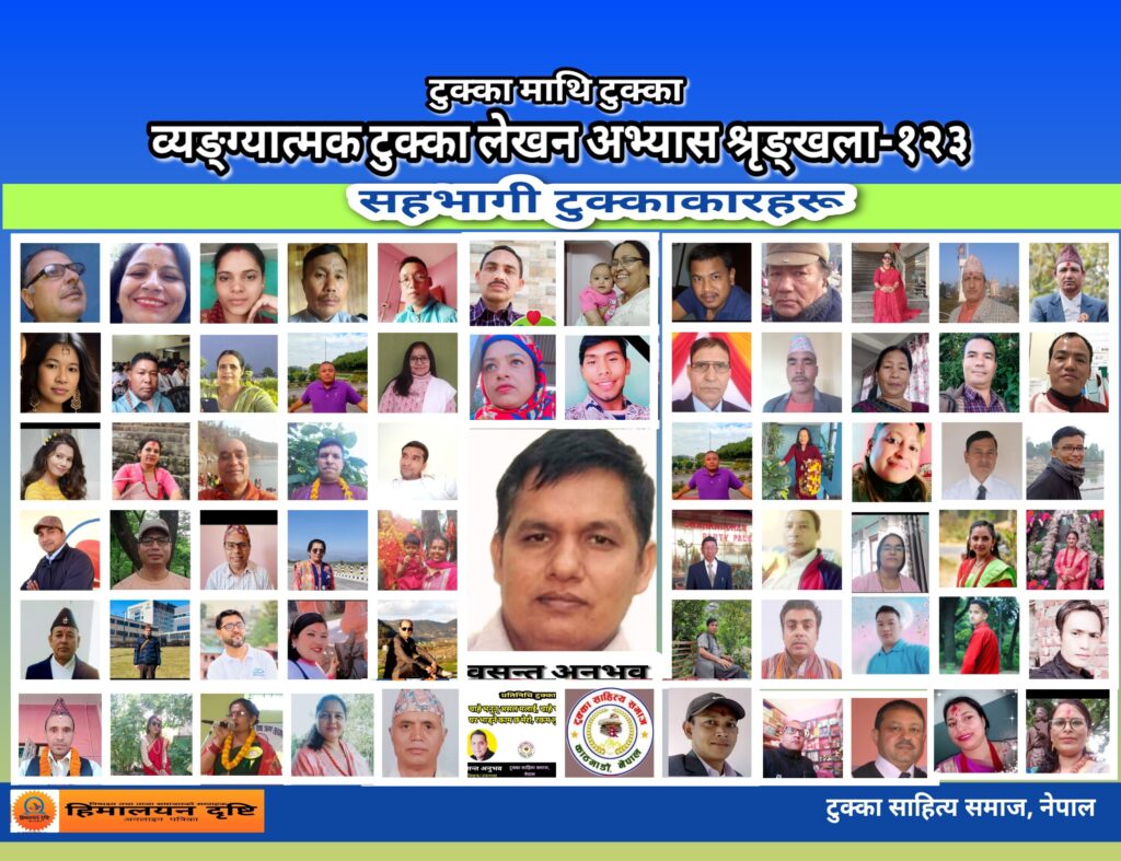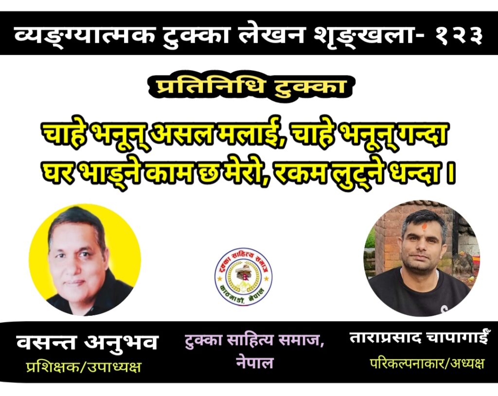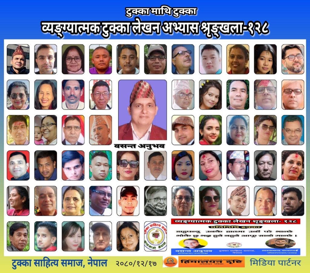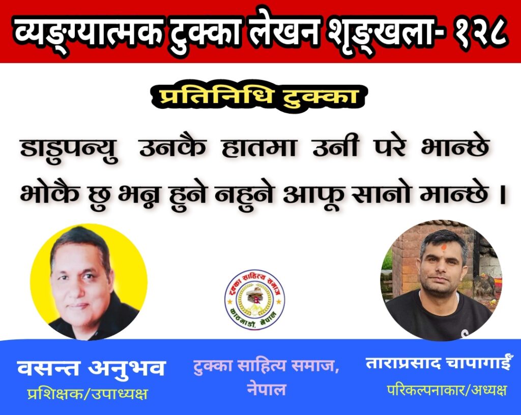 टुक्का माथि टुक्का’ व्यङ्ग्यात्मक टुक्का लेखनको १२८ औँ शृङ्खलाको लागि प्रतिनिधि टुक्काको रूपमा समाजका उपाध्यक्ष वसन्त अनुभवले समसामयिक विषयमा लेख्नुभएको व्यङ्ग्यात्मक टुक्कालाई राखिएको संयोजक अनुभवले बताउनुभयो ।